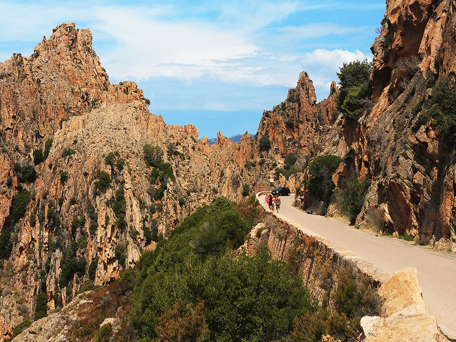 La route file vers Porto et s’élève jusqu’aux Calanques de Piana : un théâtre naturel où la roche semble en fusion et où chaque virage ouvre une nouvelle scène.